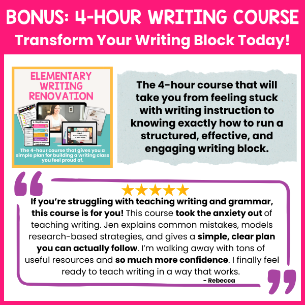 “If youโre struggling with teaching writing and grammar, this course is for you! This course took the anxiety out of teaching writing. Jen explains common mistakes, models research-based strategies, and gives a simple, clear plan you can actually follow. Iโm walking away with tons of useful resources and so much more confidence. I finally feel ready to teach writing in a way that works.”