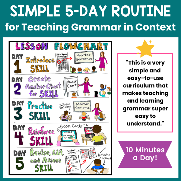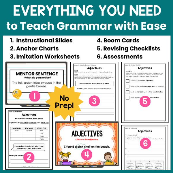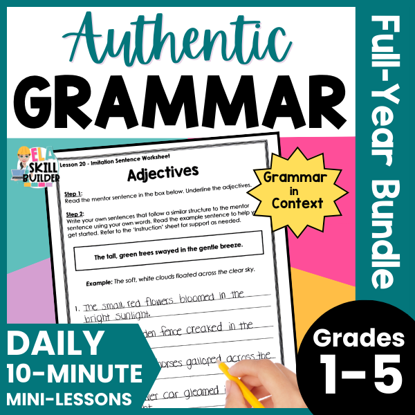 Teach grammar in context with this full-year grammar curriculum for grades 1-5!ย This authentic grammar resource includes a scope and sequence, grammatically correct sentences (mentor sentences), daily lesson plans, instructional slides, anchor charts, worksheets, checklists, and assessments –ย everything you need to help your students actually use grammar in their writing!