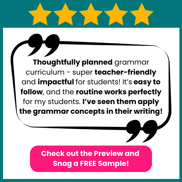 โญโญโญโญโญย I just completed my first whole week using this grammar curriculum and I am in love! The lessons were easy to implement and it was super clear for students too! I think this is going to make a world of a difference for my students this year! Every piece is golden – the Google slides, the anchor charts, the boom cards, the revising and editing checklist, the assessment rubric – my kids enjoyed every piece. Also, I had never used Boom cards before but these were a hit!ย – Cindy