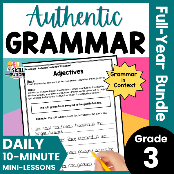 Teach grammar in context with this full-year third grade grammar curriculum! This authentic grammar resource includes a scope and sequence, grammatically correct sentences (mentor sentences), daily lesson plans, instructional slides, anchor charts, worksheets, checklists, and assessments –ย everything you need to help your students actually use grammar in their writing!