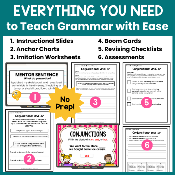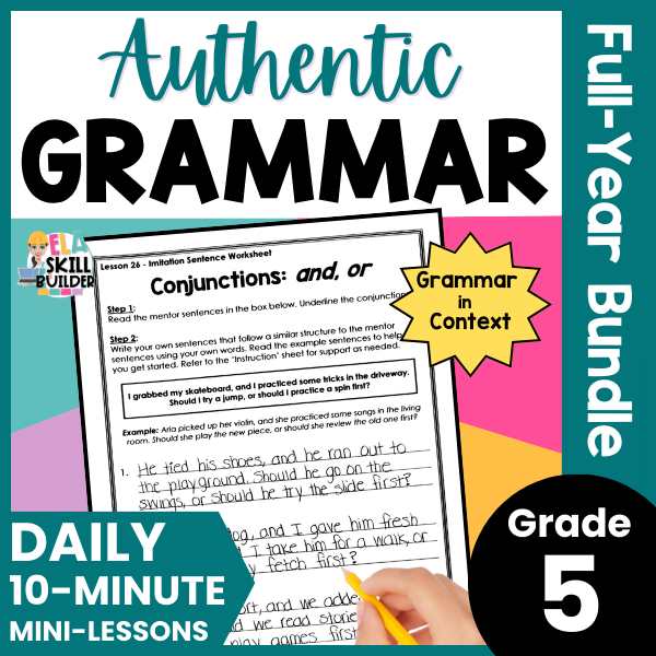 Teach grammar in context with this full-year fifth grade grammar curriculum! This authentic grammar resource includes a scope and sequence, grammatically correct sentences (mentor sentences), daily lesson plans, instructional slides, anchor charts, worksheets, checklists, and assessments –ย everything you need to help your students actually use grammar in their writing!
